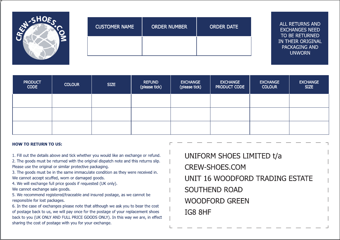6. In the case of exchanges (e.g. for size changes) please note that although we ask you to bear the cost of postage back to us, we will pay once for the postage of your replacement shoes back to you (UK ONLY AND FULL PRICE GOODS ONLY) In this way we are, in effect sharing the cost of postage with you for your exchange.
